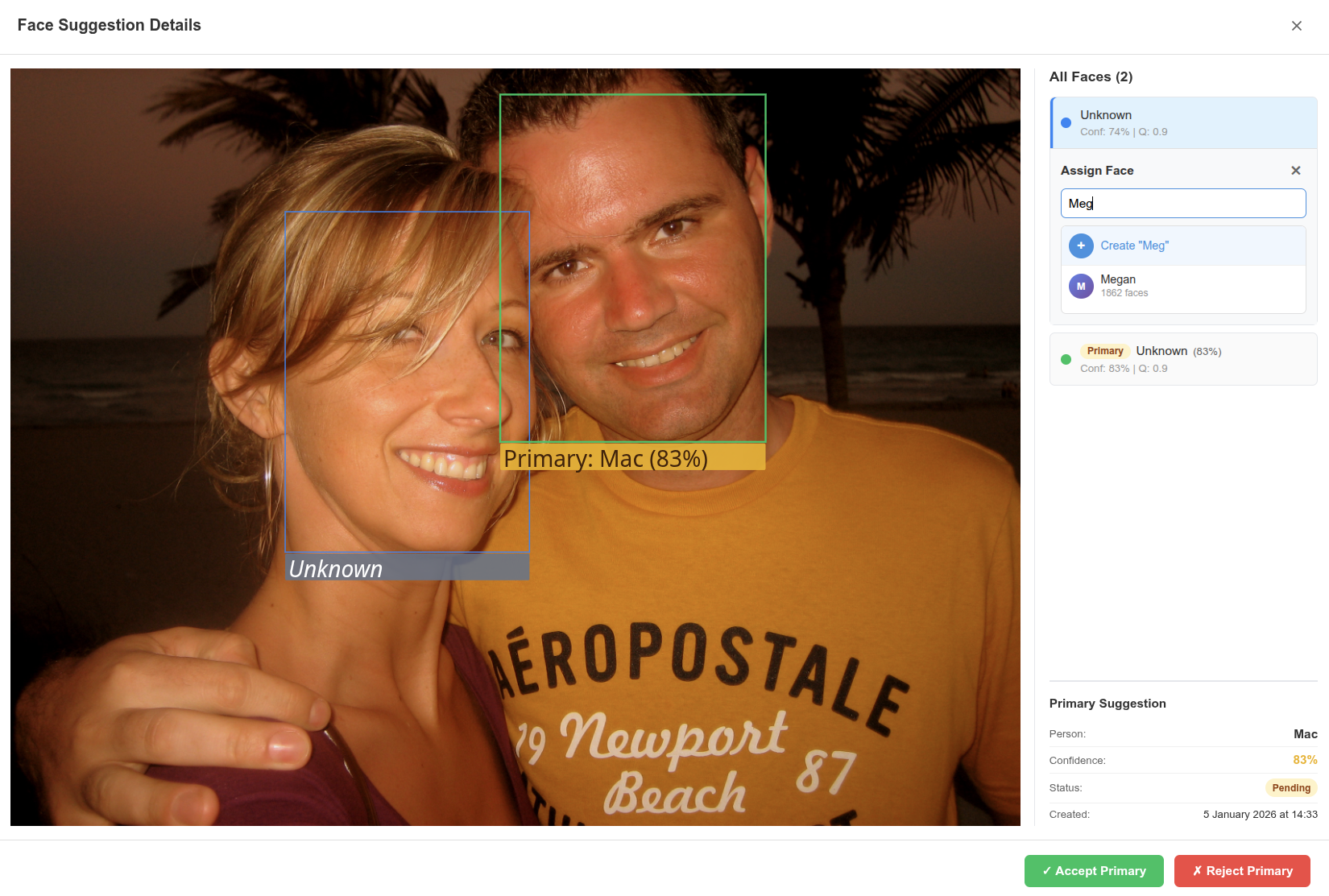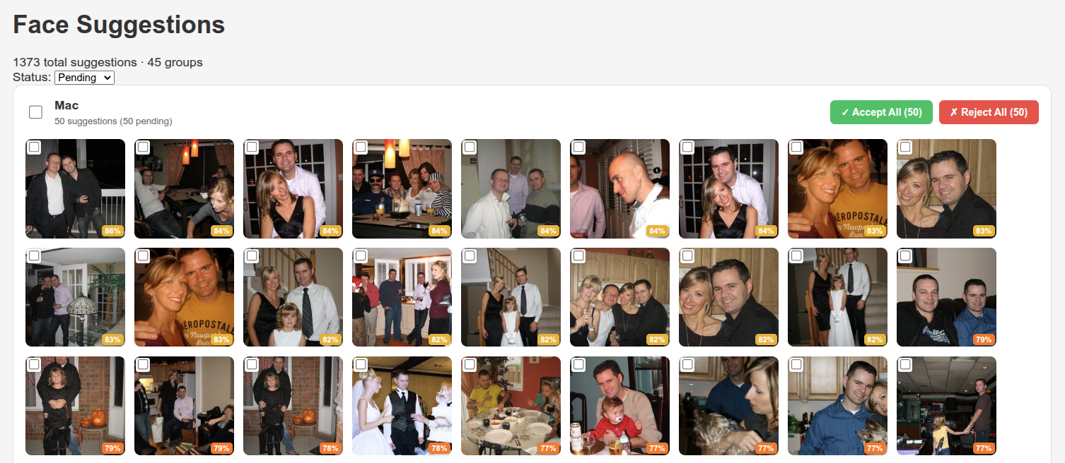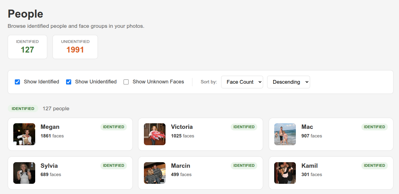 - Groups unknown faces for quick review — Unidentified faces are clustered together so you can label 50 photos of "Uncle Bob" in one click instead of 50 individual clicks