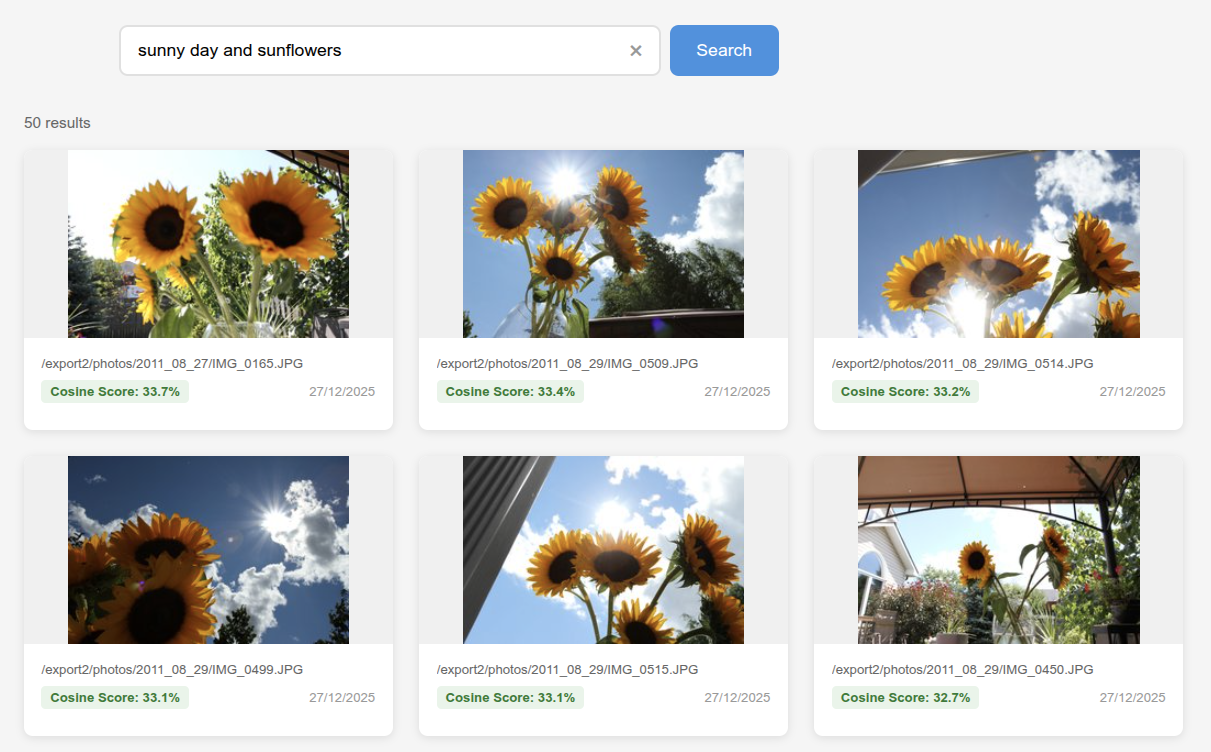 - Initial setup takes time — Processing 40,000 photos takes about one hour the first time (Linux + Cuda + GeForce RTX 4060 for reference); after that, searches are instant